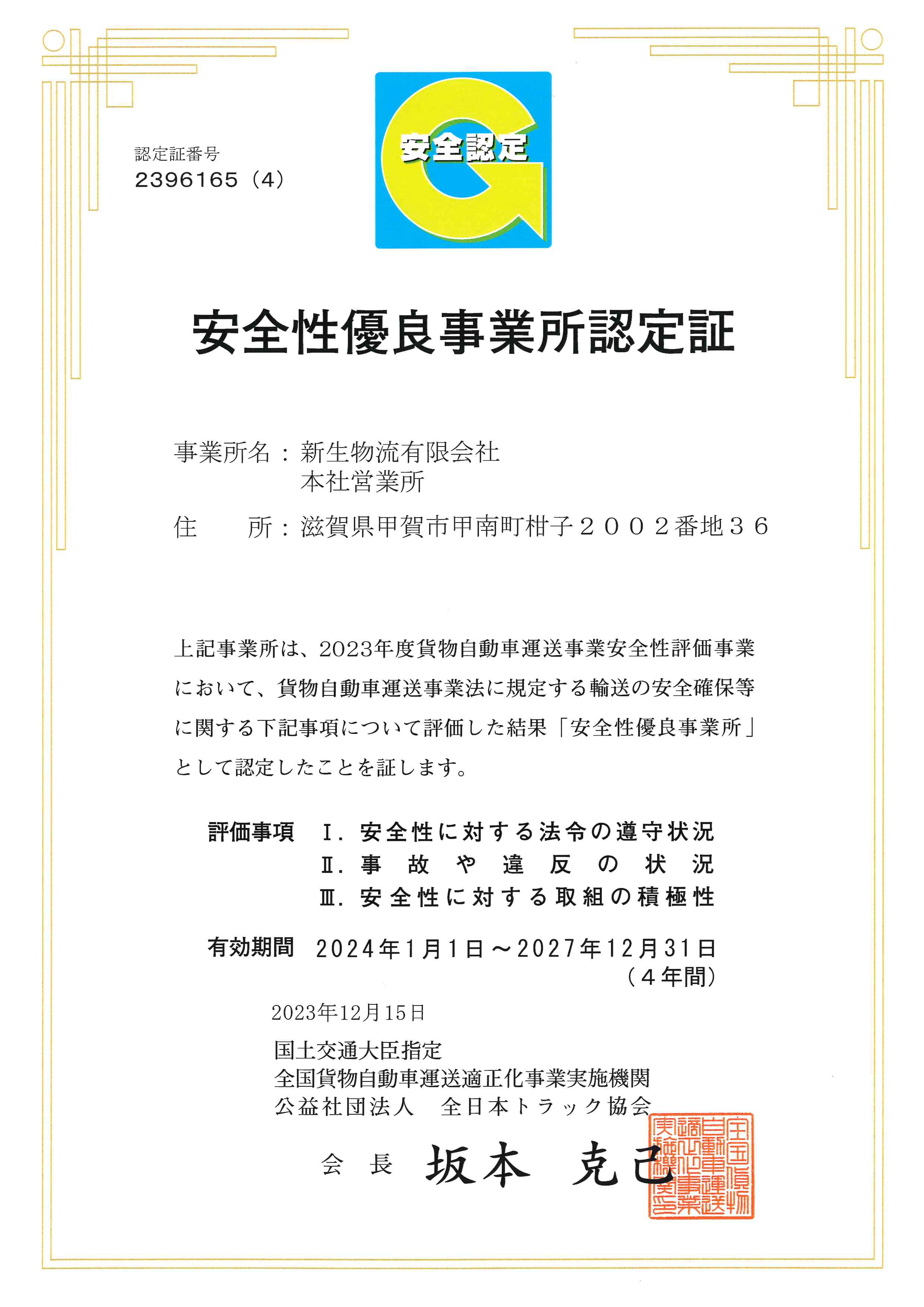 新生物流は、全日本トラック協会が定める「安全性優良事業所」(Gマーク)の認証を取得しています。 これは、安全性に対する法令遵守状況・事故や違反の状況・安全性に対する取り組みの積極性の 3つの評価項目について、一定の基準をクリアした事業所のみに与えられる認証です。